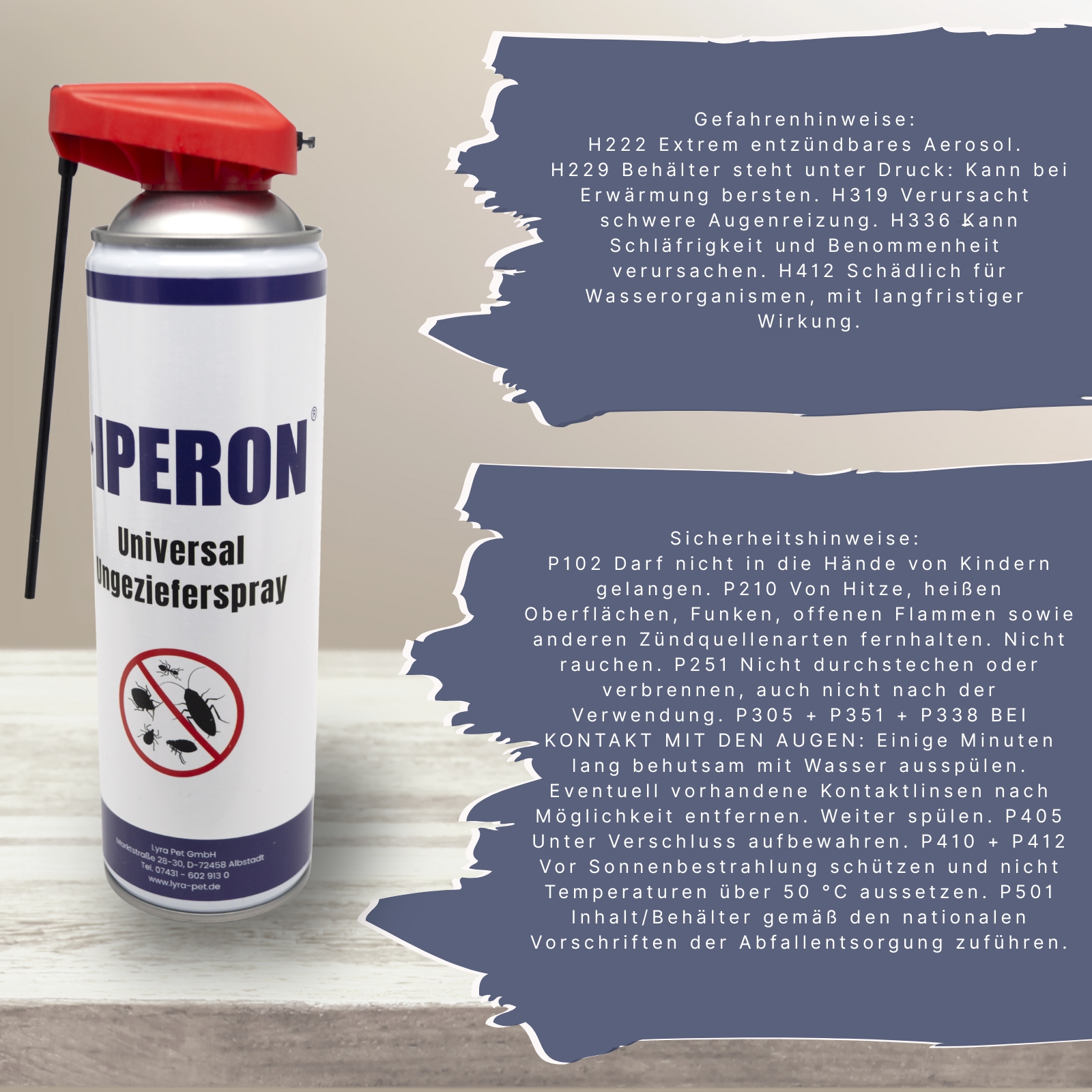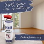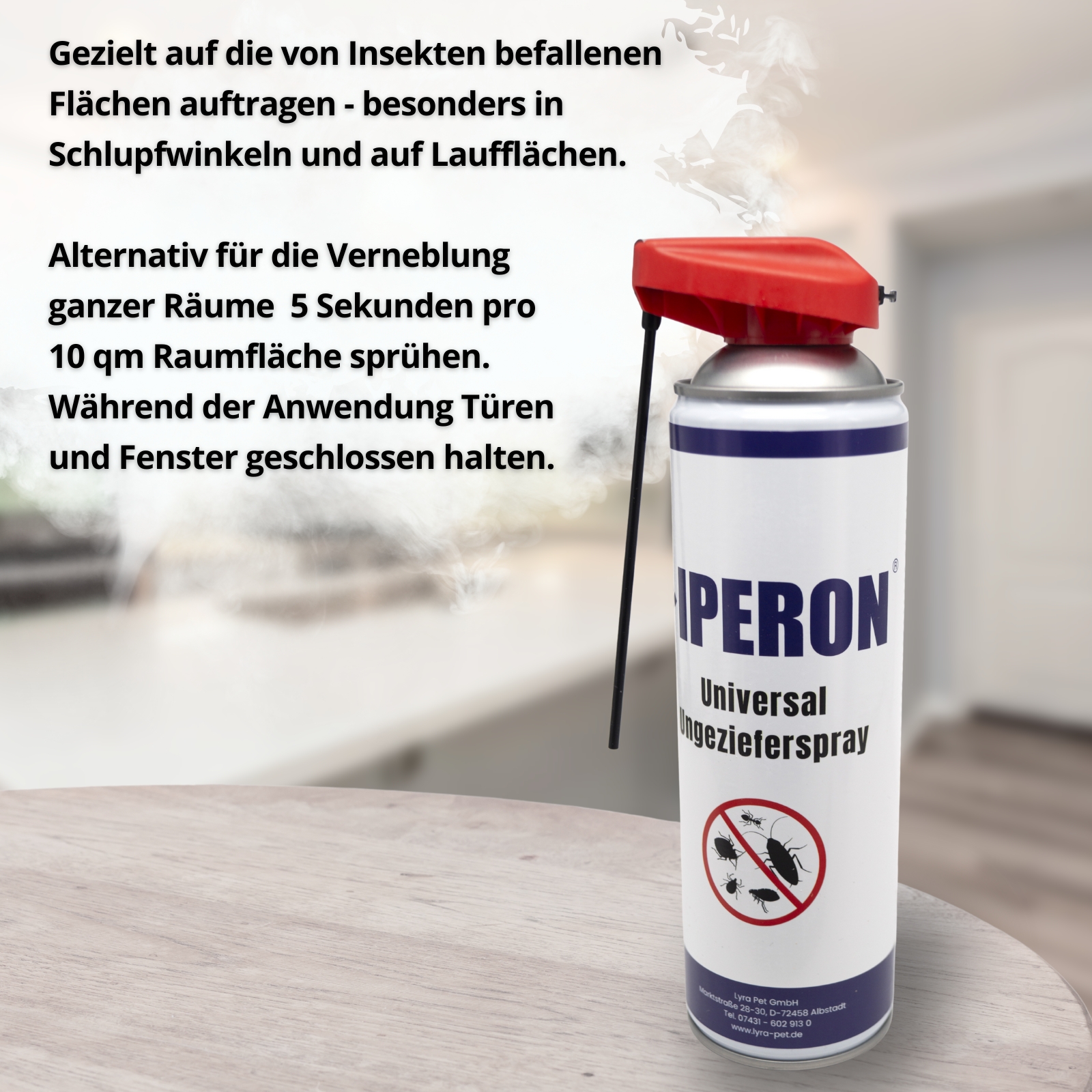 Das IPERON® Universal Ungezieferspray ist optimal für die gezielte Innenanwendung konzipiert. Sprühen Sie es direkt auf befallene Flächen, in Schlupfwinkel und auf Laufflächen des Ungeziefers. Für die Vernebelung ganzer Räume genügen 5 Sekunden Sprühdauer pro 10 m², wobei Türen und Fenster geschlossen bleiben sollten. Die Sofortwirkung des Sprays setzt bereits nach etwa 20 Minuten ein.
